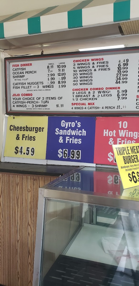 In addition to the seafood and chicken offerings, the menu features a range of classic American comfort foods. You can enjoy a Cheese Burger, a Dbl. Cheese Burger, or indulge in a tasty Gyro Sandwich.