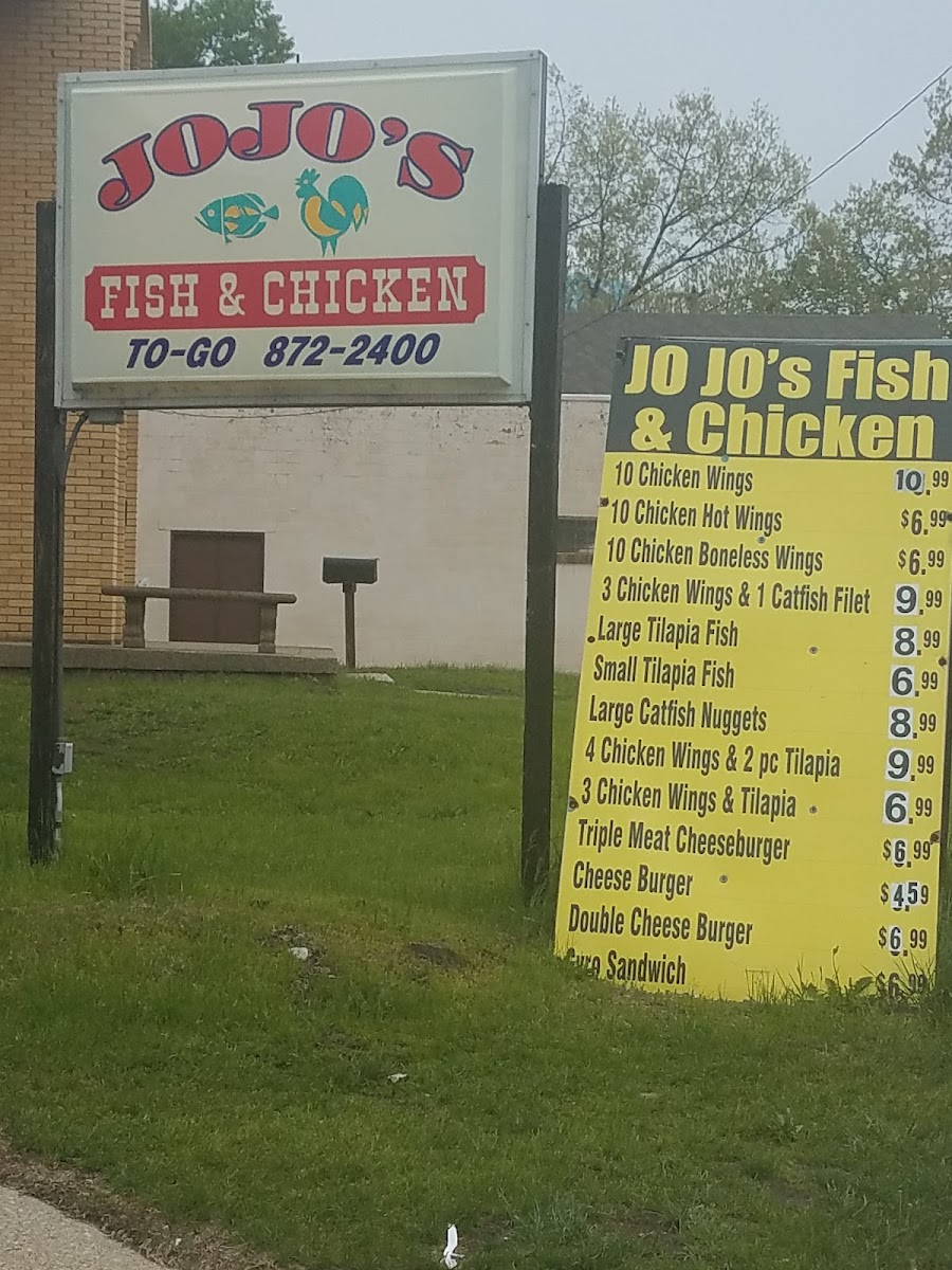 For a larger meal, Jo Jo's Fish & Chicken section presents a selection of hearty platters, including options like 10 Chicken Wings, 10 Chicken Hot Wings, 10 Chicken Boneless Wings, a combo of 3 Chicken Wings & 1 Catfish Filet, and a Large Tilapia Fish.